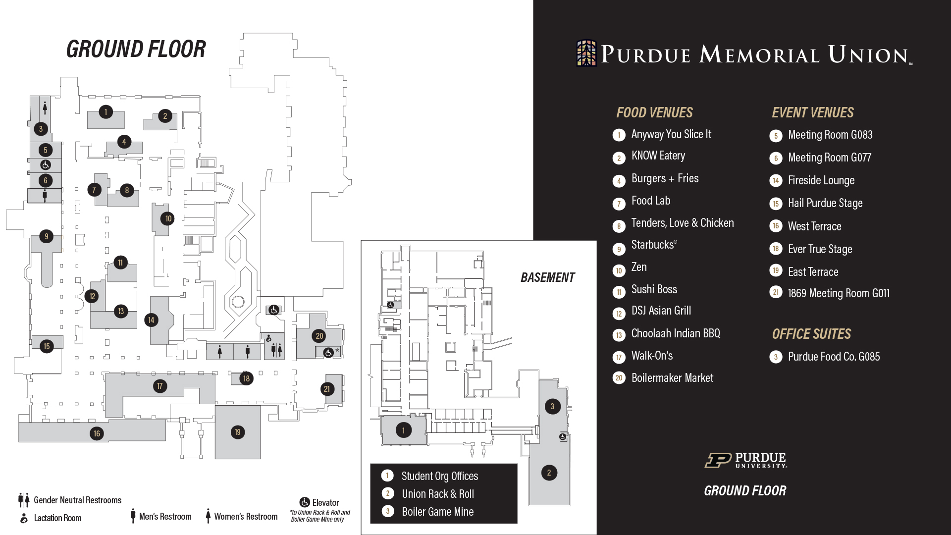 The Purdue Memorial Union's Ground Floor is home to many retail dining and service establishments.