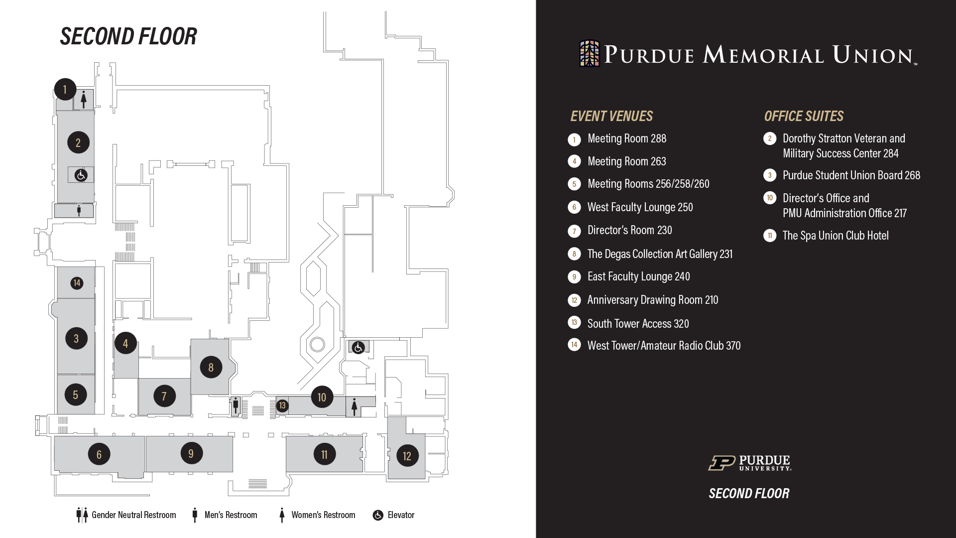 The 2nd Floor is home to the Degas Collection, Purdue Student Union Board, and several meeting spaces.